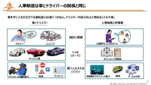 人事制度をこれに当てはめてみると、車=人事制度、ドライバー=評価者であるマネージャー、運転能力=マネジメント能力ということになります。デザイナーやエンジニアに当たる部分は自前でやる場合は人事部門、外部に発注する場合は我々コンサルタントとなります。