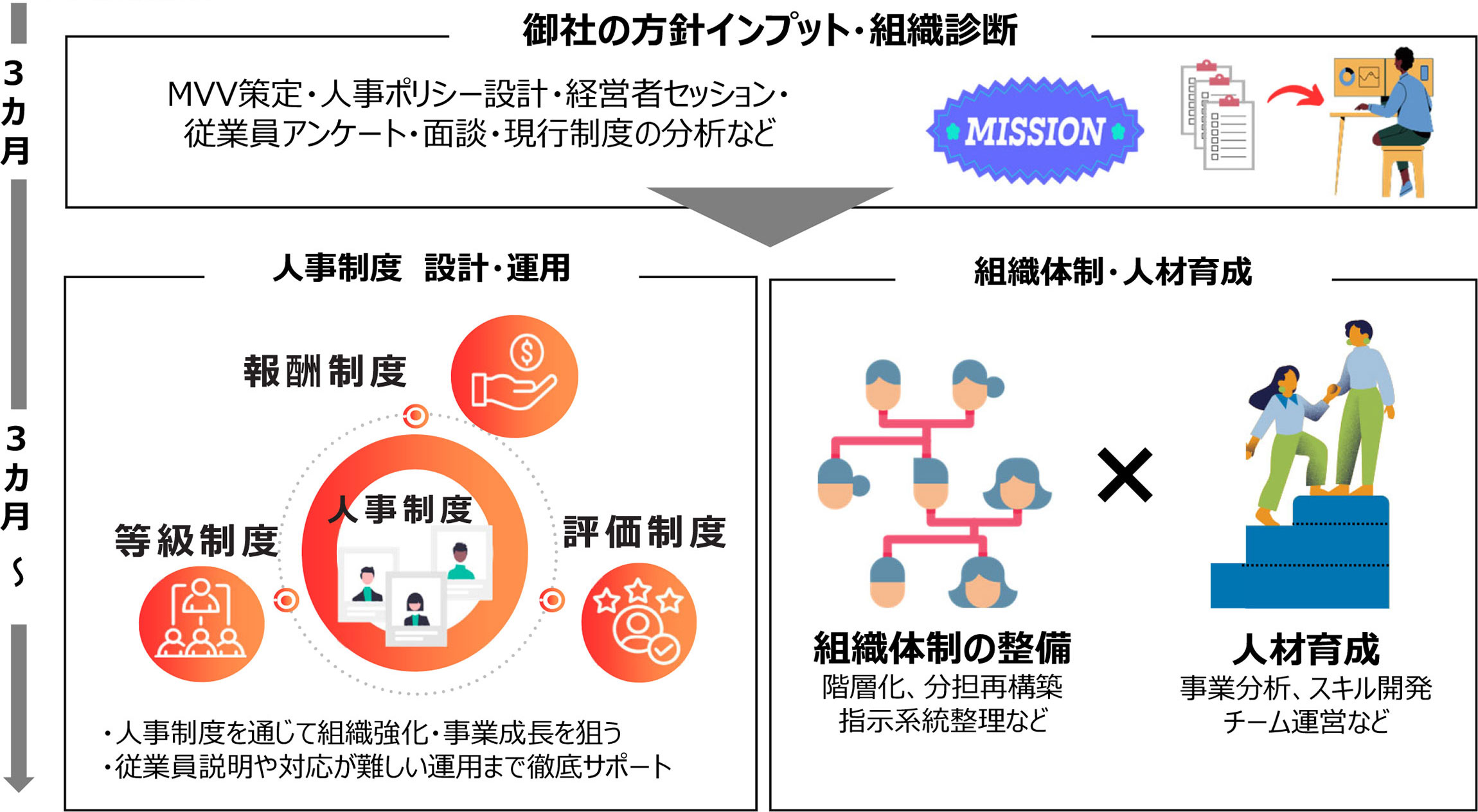 当社では、担当者からの丁寧なヒアリングをもとにした業務棚卸、チーム編成や分担整理、業務ローテーション計画を支援いたします。また、人事制度と掛け合わせることで「頑張った人」「できる人」を逃がさない人材育成をめざします。