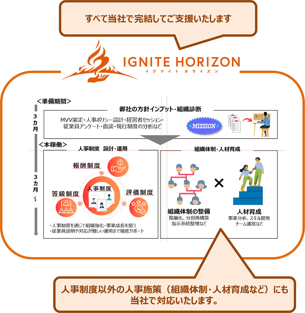そこで、IGNITE HORIZONでは、誰でも運用できる人事制度を策定し、運用中も軌道修正できるよう伴走します。